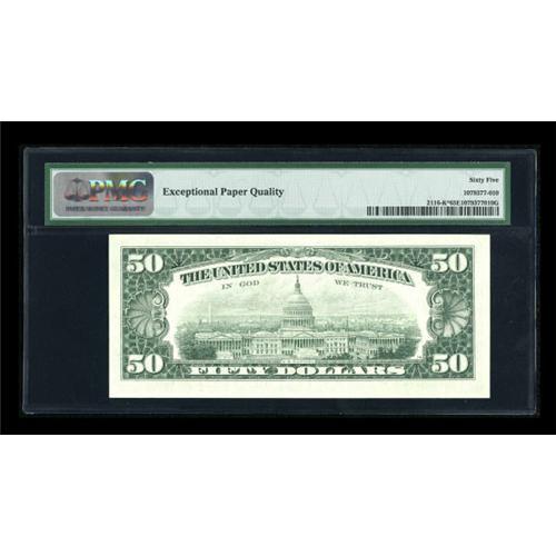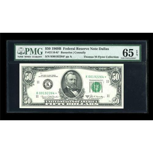 <B>Fr. 2116-K* $50 1969B Federal Reserve Note. PMG Gem Uncirculated 65 EPQ.</B></I><BR> The Dallas district was the only one to issue star notes, with a print run of only 128,000 pieces. This would be the new high number. PMG has graded six examples to date, four low grade circulated examples along with one 66 and this sole 65. <BR><I>From The Thomas M. Flynn Collection</B></I><BR><BR><b>Shipping:</b> Coins & Currency (<a target="_blank" href="http://www.heritageauctions.com/common/shipping.php">view shipping information</a>)