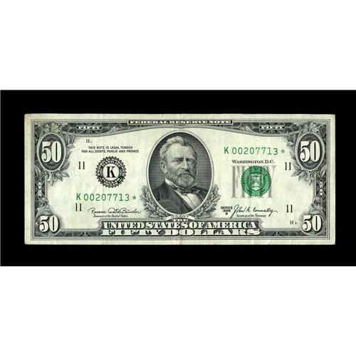<B>Fr. 2116-K* $50 1969B Federal Reserve Note. Very Fine-Extremely Fine.</B></I><BR>The holy grail of the modern fifty denomination set is this star note. Only the Dallas district had stars printed during this issue and with a printing of only 128,000 they are downright rare. Auction appearances for this star are few and far between and this beauty should fill into any collection rather nicely and would be the cornerstone of all but the most advanced Fed collections. The paper is crisp and fresh with great color and excellent eye appeal.<BR><BR><b>Shipping:</b> Coin/Currency (<a target="_blank" href="http://www.heritageauctions.com/common/shipping.php">view shipping information</a>)