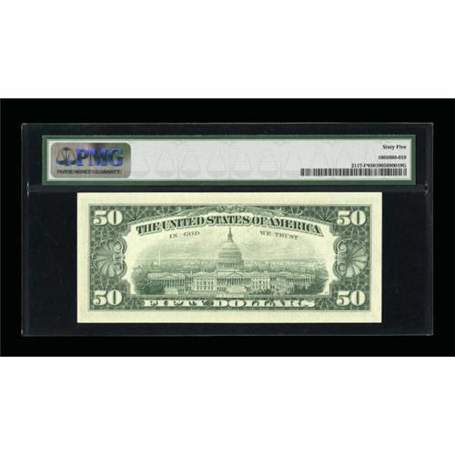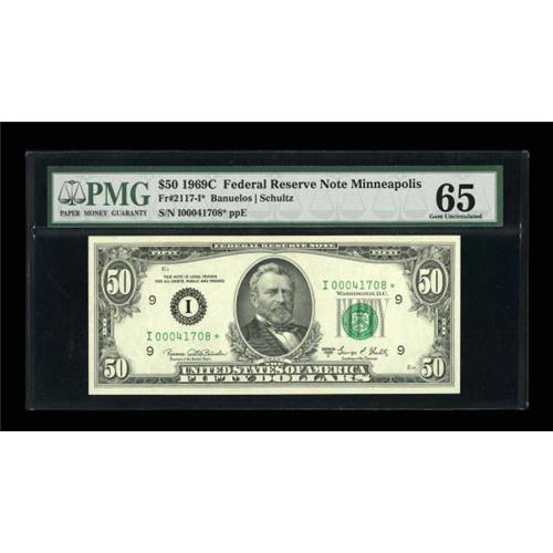 <B>Fr. 2117-I* $50 1969C Federal Reserve Note. PMG Gem Uncirculated 65.</B></I><BR> Only 64,000 replacements were printed for the Minneapolis district. This note is nicely margined and well centered.<BR><BR><b>Shipping:</b> Coins & Currency (<a target="_blank" href="http://www.heritageauctions.com/common/shipping.php">view shipping information</a>)