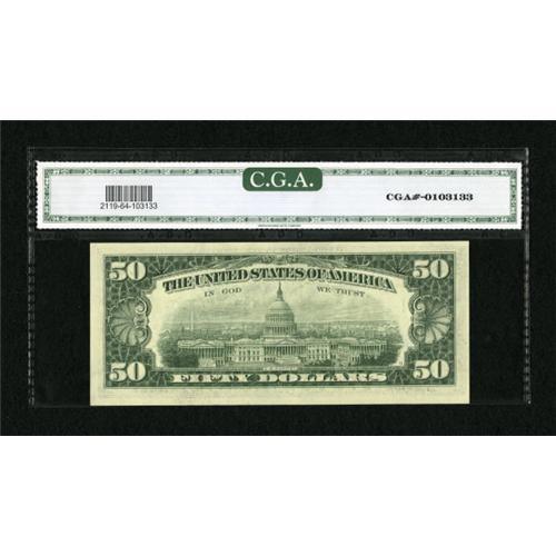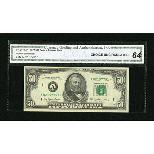 <B>Fr. 2119-A* $50 1977 Federal Reserve Note. CGA Choice Uncirculated 64.</B></I><BR> Strong embossing and some minor corner handling can be observed through the third party holder.<BR><BR><b>Shipping:</b> Coins & Currency (<a target="_blank" href="http://www.heritageauctions.com/common/shipping.php">view shipping information</a>)