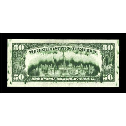 <B>Fr. 2119-A $50 1977 Federal Reserve Note. Choice About Uncirculated.</B></I><BR> This interesting error makes the U.S. Capitol look like it is radiating. A neat smear on a tough denomination for this type of error.<BR><BR><b>Shipping:</b> Coins & Currency (<a target="_blank" href="http://www.heritageauctions.com/common/shipping.php">view shipping information</a>)