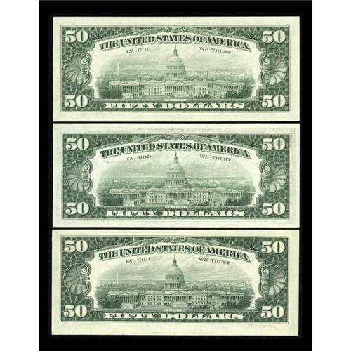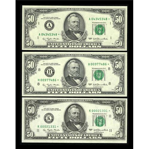 <B>Fr. 2119-A*; H*; K* $50 1977 Federal Reserve Notes. Choice Crisp Uncirculated or Better.</B></I><BR> Both seals on each of these notes are boldly embossed.<BR><I>From The Thomas M. Flynn Collection</B></I><BR><BR><b>Shipping:</b> Coins & Currency (<a target="_blank" href="http://www.heritageauctions.com/common/shipping.php">view shipping information</a>)