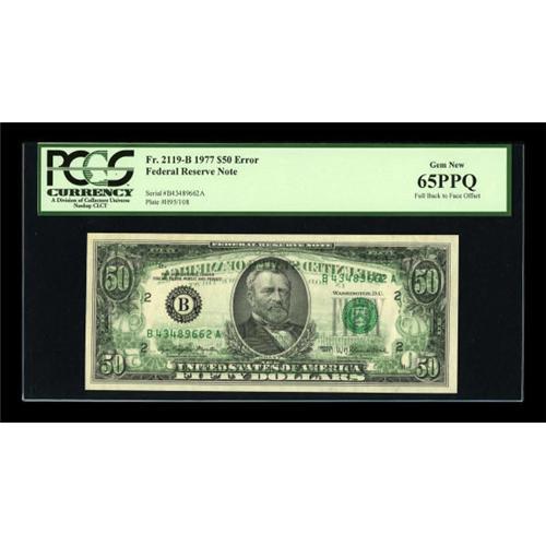 <B>Fr. 2119-B $50 1977 Federal Reserve Note. PCGS Gem New 65PPQ.</B></I><BR> Fifties are a hard denomination for errors in general, but this example sports a very dark back to face 100% offset. This is a great error that has much eye appeal.<BR><I>From The Walla Walla Collection</B></I><BR><BR><b>Shipping:</b> Coins & Currency (<a target="_blank" href="http://www.heritageauctions.com/common/shipping.php">view shipping information</a>)