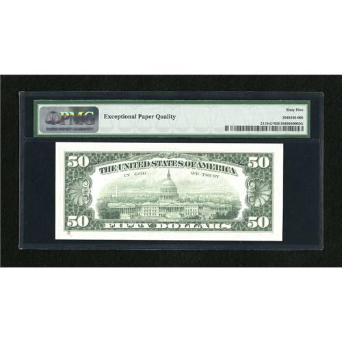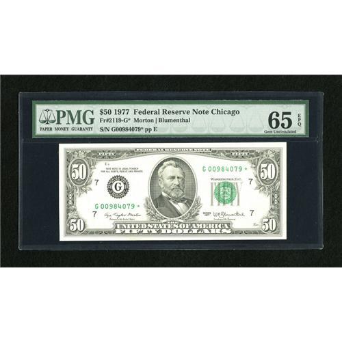 <B>Fr. 2119-G* $50 1977 Federal Reserve Note. PMG Gem Uncirculated 65 EPQ.</B></I><BR>Bold embossing is noted on both sides of this Star.<BR><I>From The Bill and Kathy Stella Currency Collection</B></I><BR><BR><b>Shipping:</b> Coins & Currency (<a target="_blank" href="http://www.heritageauctions.com/common/shipping.php">view shipping information</a>)