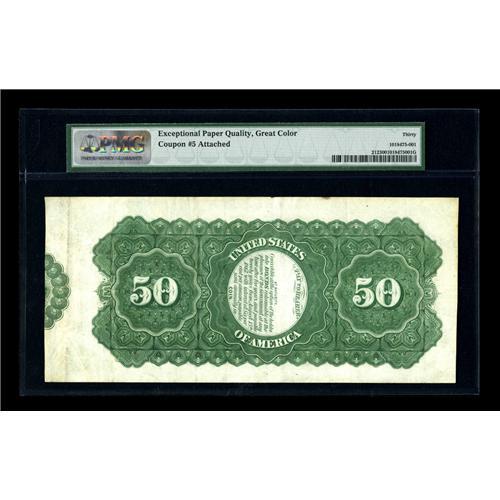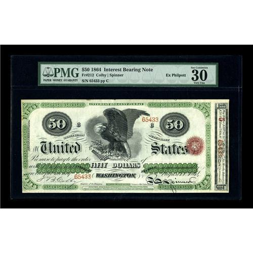 <B>Fr. 212 $50 1864 Interest Bearing Note PMG Very Fine 30 EPQ.</B></I> Three-Year Interest Bearing Notes were issued under the same act that introduced Demand Notes and were issued in the denominations of $50, $100, and $500, $1,000, and $5,000. Each note paid 7.3% and had five coupons attached that were redeemable for the accrued interest in five equal disbursements. The Act of June 30, 1864 allowed the printing of this $50 denomination as well as a $100 and $500 denomination.<BR><BR>Currently only seven examples of this 1864 $50 issue are known to collectors, and after having handled three other mid-grade examples, we can support the Hessler-Chambliss statement that this is the finest of surviving pieces. This example was graded About Uncirculated when it first appeared in 1964 as part of the William A. Philpott Collection and we can certainly see why, as the colors and paper quality are truly exceptional for a note of this issue. PMG has recognized this as well, noting on the holder "Exceptional Paper Quality" and "Great Color" The vast majority of Interest Bearing Notes show at least some restoration work, but this specimen is utterly free of any trace of even the most minor restoration or "improvement." With truly rare notes setting new price records at every offering, look for this important type note to see bidding easily reach and likely well exceed...<BR><BR><b>Shipping:</b> Coin/Currency (<a target="_blank" href="http://www.heritageauctions.com/common/shipping.php">view shipping information</a>)