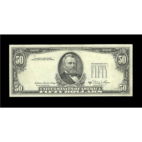 <B>Fr. 2121-D $50 1981A Federal Reserve Note. About Uncirculated.</B></I> A nice example of this high denomination with the third printing on the reverse.
