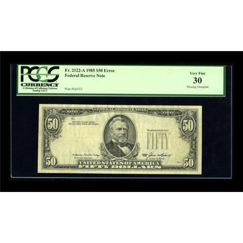 <B>Fr. 2122-? $50 1985 Federal Reserve Note. PCGS Very Fine 30.</B></I><BR> This nifty Fifty totally bypassed the third printing.<BR><I>From The Walla Walla Collection</B></I><BR><BR><b>Shipping:</b> Coins & Currency (<a target="_blank" href="http://www.heritageauctions.com/common/shipping.php">view shipping information</a>)