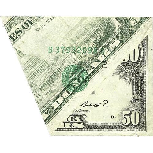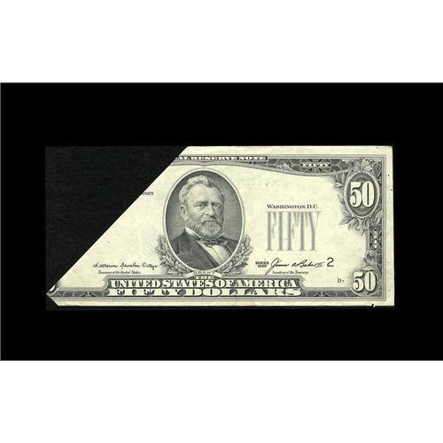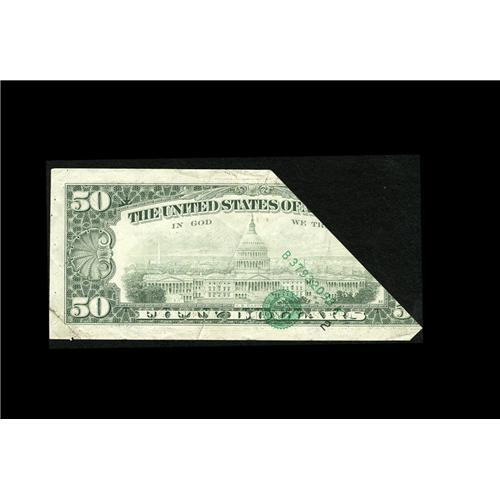 <B>Fr. 2122-B $50 1985 Federal Reserve Note. Very Fine-Extremely Fine.</B></I><BR>This bizarre cutting error has left us with what appears to be a half of a note. If only the bookends would have been saved. Given a split grade due to the pinholes that held this captivating error in place for all to see.