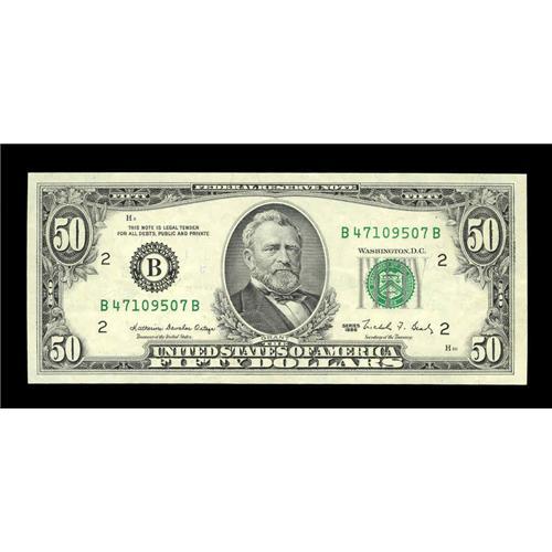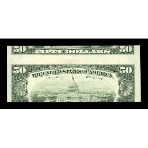 <B>Fr. 2123-B $50 1988 Federal Reserve Note. Choice About Uncirculated.</B></I> A little bit of handling is responsible for the grade on this otherwise Gem note invert. Because of the selvage on modern notes, the inverted back is off center showing parts of two notes.