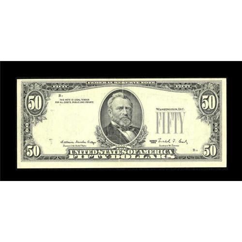 <B>Fr. 2123-G $50 1988 Federal Reserve Note. About Uncirculated.</B></I><BR> This is an elusive issue for this error to occur on. A pair of light center folds parallel to each other account for the grade.<BR><BR><b>Shipping:</b> Coins & Currency (<a target="_blank" href="http://www.heritageauctions.com/common/shipping.php">view shipping information</a>)