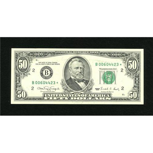 <B>Fr. 2124-B* $50 1990 Federal Reserve Note. Gem Crisp Uncirculated.</B></I><BR>An essentially superb gem star that has huge margins and a light offset across the lettering.<BR><BR><b>Shipping:</b> Coins & Currency (<a target="_blank" href="http://www.heritageauctions.com/common/shipping.php">view shipping information</a>)