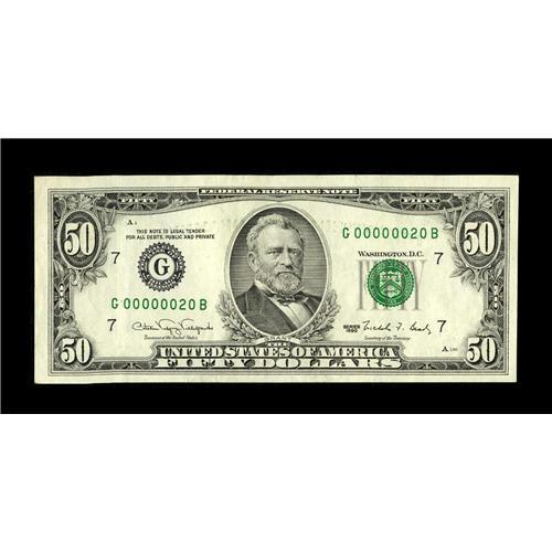 <B>Fr. 2124-G $50 1990 Federal Reserve Note. Choice About Uncirculated.</B></I><BR>The low serial number for this note is G00000020B. A faint center fold is detected.<BR><BR><b>Shipping:</b> Coin/Currency (<a target="_blank" href="http://www.heritageauctions.com/common/shipping.php">view shipping information</a>)