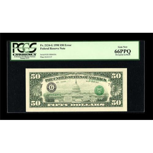 <B>Fr. 2124-G $50 1990 Federal Reserve Note. PCGS Gem New 66PPQ.</B></I><BR> The back margins are truly huge on this ever elusive error with serial number on the back. The eye appeal and originality make this note one of the nicest examples of this error we have seen.<BR><BR><b>Shipping:</b> Coins & Currency (<a target="_blank" href="http://www.heritageauctions.com/common/shipping.php">view shipping information</a>)