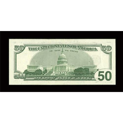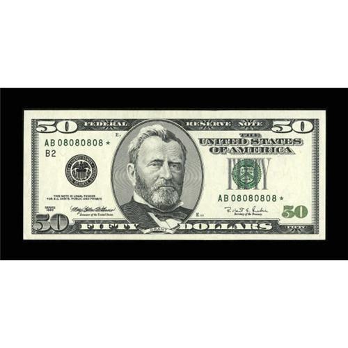 <B>Fr. 2126-B* $50 1996 Federal Reserve Note. Super Repeater. About Uncirculated.</B></I><BR> Super repeating serial number AB08080808* is seen on this once folded note that also exhibits a small amount of handling. A rare number for this denomination and a replacement to boot.<BR><BR><b>Shipping:</b> Coins & Currency (<a target="_blank" href="http://www.heritageauctions.com/common/shipping.php">view shipping information</a>)