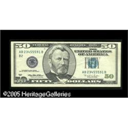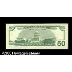 <B>Fr. 2126-B $50 1996 Federal Reserve Note. Extremely Fine.</B></I><BR>The serial numbers, Federal Reserve seal, and Treasury seal are all off their normal color. The serial numbers are in odd green. The Treasury seal a distinct blue, and the Federal Reserve seal, which ought to be black, has a slightly purplish cast to it. We're not entirely sure what has happened here, but it seems to be ink contamination of some sort. Lot:15400