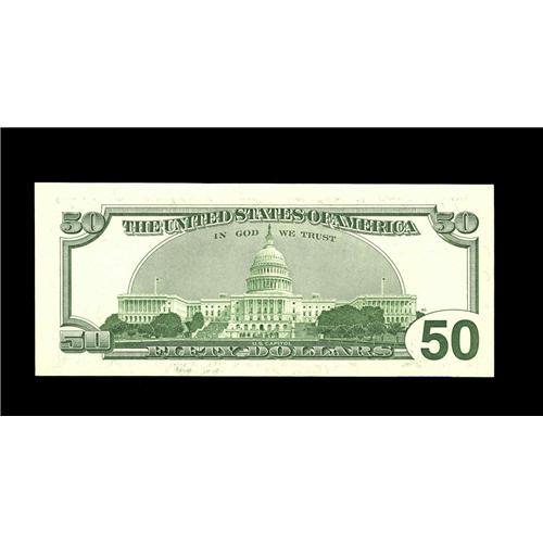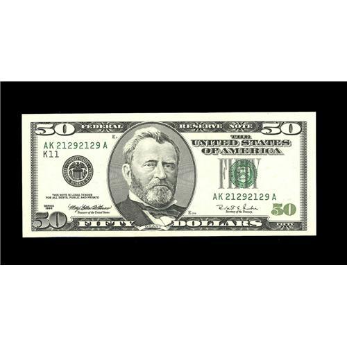 <B>Fr. 2126-K $50 1996 Federal Reserve Note. Choice Crisp Uncirculated.</B></I><BR>This repeater is a little tight at the bottom margin.