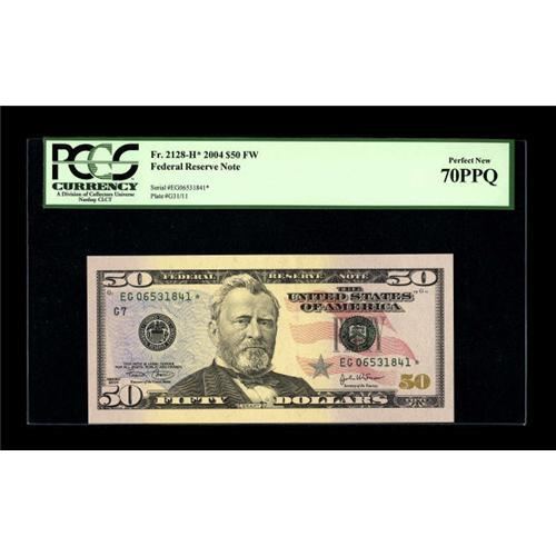 <B>Fr. 2128-G* $50 2004 Federal Reserve Note. PCGS Perfect New 70PPQ.</B></I><BR>What can be said about a note that has received a Perfect grade?<BR><BR><b>Shipping:</b> Coin/Currency (<a target="_blank" href="http://www.heritageauctions.com/common/shipping.php">view shipping information</a>)