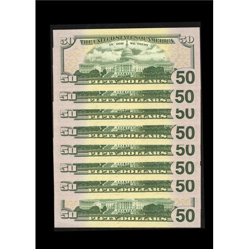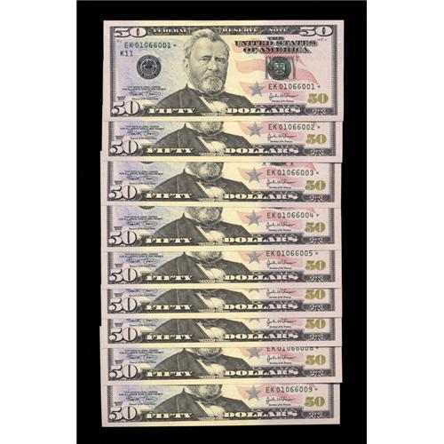 <B>Fr. 2128-K* $50 2004 Federal Reserve Notes. Nine Consecutive Examples. Superb Gem Crisp Uncirculated.</B></I><BR>All Series 2004 $50 notes were printed at the Fort Worth facility of the BEP. Star notes were printed for three different districts and Dallas ranks second in rarity. Currently the Oakes and Schwartz reference lists the premium on these pieces at $150 each, for a total catalog value of $1350. We expect this group to realize at least. . .<BR>