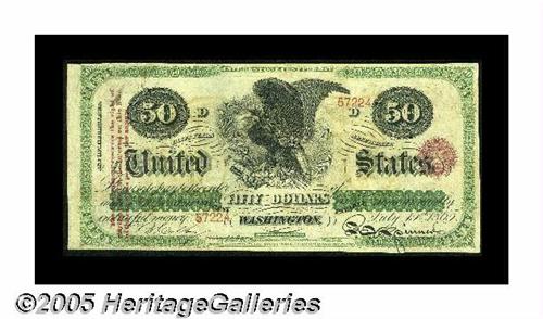 <B>Fr. 212d $50 1865 Interest Bearing Note Fine-Very Fine.</B></I> This gorgeous example is one of only nine examples known, two of which are definitively counterfeit and a third very likely so. This piece is only a touch in grade below our Taylor example which realized a hair under $40,000. Middle of the book notes have only recently begun to attract the attention they deserve and this well margined, handsome piece is very likely to do just about as well as the Taylor example did.