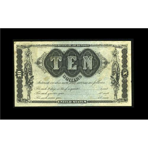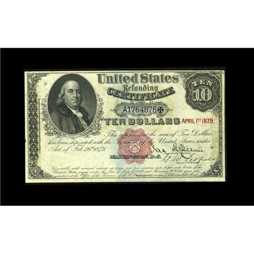 <B>Fr. 214 $10 1879 Refunding Certificate Choice New.</B></I> A little close across the top, excellent color, good paper surfaces and a terrific overall appearence. This interesting note was issued in an attempt to give the average citizen an opportunity to own government securities. Refunding Certificates were issued with interest accruing at four percent with no definite redemption date stated, providing an inducement to hold the notes and not cash them in. In 1907, the interest was stopped and the value set at $21.30, causing them to be redeemed.