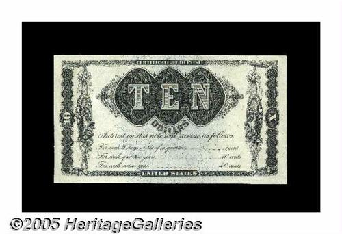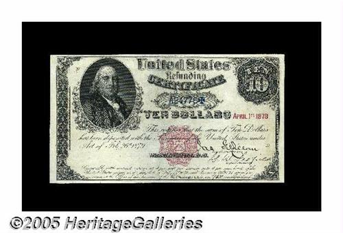 <B>Fr. 214 $10 1879 Refunding Certificate Extremely Fine.</B></I> A broadly margined example of this odd-sized type. The note appears Gem at a glance, but closer inspection reveals a few light folds. It's a most attractive piece, with good color, lots of eye appeal and nice paper surfaces.