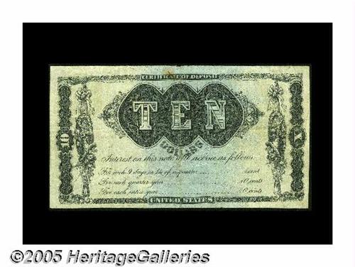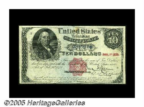 <B>Fr. 214 $10 1879 Refunding Certificate Fine-Very Fine.</B></I> This interesting note was issued in an attempt to give the average citizen an opportunity to own government securities. Refunding Certificates were issued with interest accruing at four percent with no definite redemption date stated, providing an inducement to hold the notes and not cash them in. In 1907, the interest was stopped and the value set at $21.30, causing them to be redeemed.