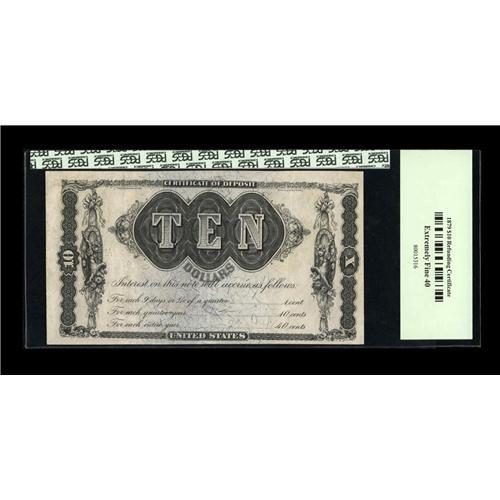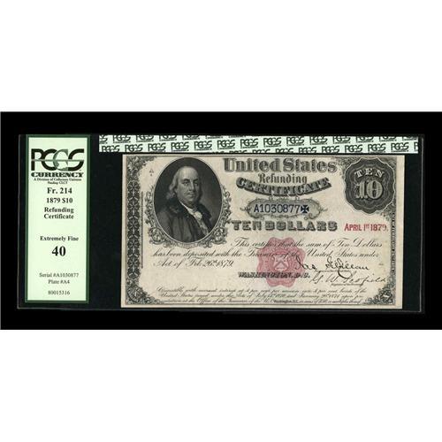 <B>Fr. 214 $10 1879 Refunding Certificate PCGS Extremely Fine 40.</B></I> A nicely margined example of this odd-sized type. The note appears Gem at a glance, but closer inspection reveals a few light folds. It's a most attractive piece, with good color, lots of eye appeal and nice paper surfaces.