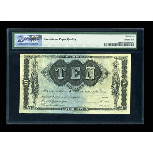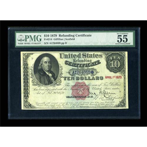 <B>Fr. 214 $10 1879 Refunding Certificate PMG About Uncirculated 55 EPQ.</B></I> This handsome Refunding Certificate is returning to the auction block after more than fifteen years. It last sold in a January 1991 Bowers sale. This particular example is on watermarked paper with a blue security stain. PMG has given it their "Exceptional Paper Quality," comment which, on this early-graded note, appears only on the back. They will update the holder and include the EPQ on the front if requested. We sold a PMG 45 Fr. 214 in our January sale for a touch over $8000. This piece should do quite a bit better.<BR><BR><b>Shipping:</b> Coins & Currency (<a target="_blank" href="http://www.heritageauctions.com/common/shipping.php">view shipping information</a>)