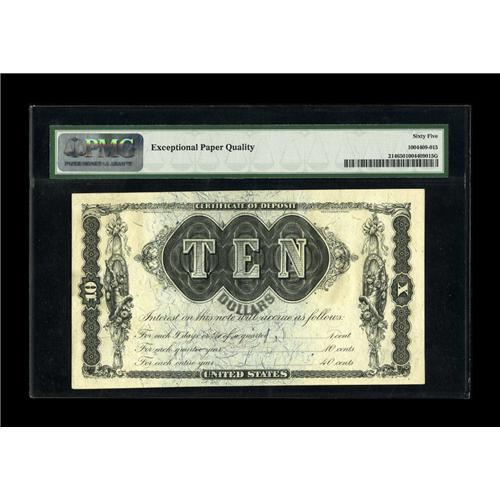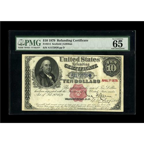 <B>Fr. 214 $10 1879 Refunding Certificate PMG Gem Uncirculated 65 EPQ.</B></I> This is the highest third-party graded Refunding Certificate we have been able to offer. These notes were really circulating interest bearing instruments similar to savings bonds. The interest on these notes was stopped by Congress in 1907, fixing the redemption value at $21.30. You can see the originality of this note through the third-party holder.<BR><BR><b>Shipping:</b> Coin/Currency (<a target="_blank" href="http://www.heritageauctions.com/common/shipping.php">view shipping information</a>)