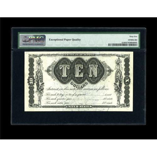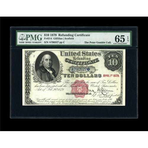 <B>Fr. 214 $10 1879 Refunding Certificate PMG Gem Uncirculated 65 EPQ.</B></I> Off the market since 1999, this is one of the very finest of the Fr. 214s in existence. Only one superior graded example has crossed the auction block--a PMG 66, which sold in June 2006 for well over $20,000. Refunding Certificates were issued with interest accruing at four percent with no definite redemption date stated, providing an inducement to hold the notes and not cash them in. In 1907, the interest was stopped and the value set at $21.30, causing them to be redeemed. This piece is right behind the sole PMG 66 quality wise with terrific margins, beautiful colors, and bold original embossing that can be easily seen through the PMG EPQ holder. A note that belongs in a high-quality type set. <BR><I>From The Peter Gamble Collection.</B></I><BR><BR><b>Shipping:</b> Coins & Currency (<a target="_blank" href="http://www.heritageauctions.com/common/shipping.php">view shipping information</a>)