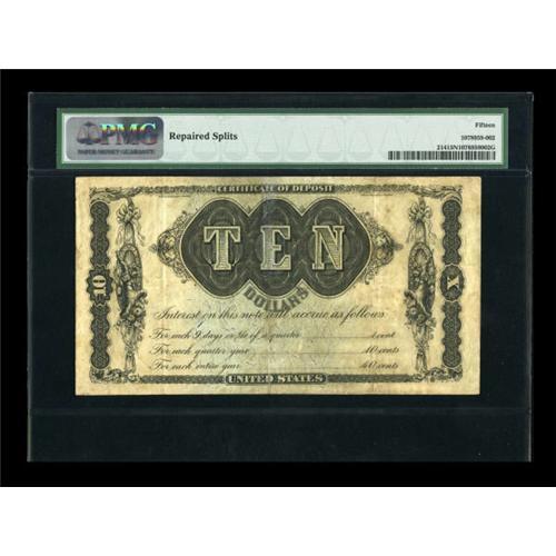 <B>Fr. 214 $10 1879 Refunding Certificate PMG Choice Fine 15 Net.</B></I> This is an affordable example of this scarce and unusual design type, with plenty of eye appeal for the grade. A small split at the center fold has been professionally closed, but the overall appearance is outstanding for the grade. An impressive note that will enhance any circulated type collection.<BR><BR><b>Shipping:</b> Coins & Currency (<a target="_blank" href="http://www.heritageauctions.com/common/shipping.php">view shipping information</a>)