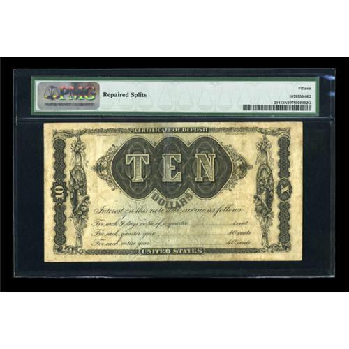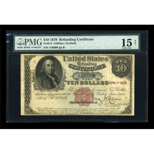 <B>Fr. 214 $10 1879 Refunding Certificate PMG Choice Fine 15 NET.</B></I> PMG has noted, "Repaired Splits." They are not particularly distracting, and this should prove to be an affordable example of a much scarcer type. Refunding Certificates were issued with interest accruing at four percent with no definite redemption date stated, providing an inducement to hold the notes and not cash them in. In 1907, the interest was stopped and the value set at $21.30, causing them to be redeemed. They're quite scarce today in all grades.<BR><BR><b>Shipping:</b> Coins & Currency (<a target="_blank" href="http://www.heritageauctions.com/common/shipping.php">view shipping information</a>)