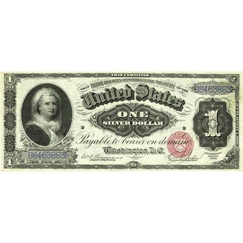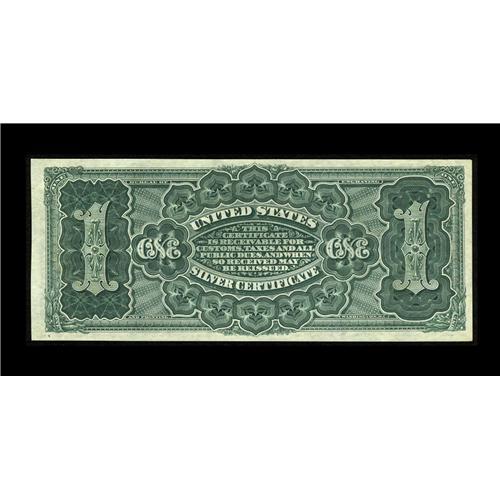 <B>Fr. 215 $1 1886 Silver Certificate Gem New.</B></I> This perfectly original specimen boasts margin sufficient for a Superb grade though a hint of handling keeps it from achieving that lofty grade. The embossing is bold as are the colors.<BR><I>From The Plymouth Rock Collection</B></I>
