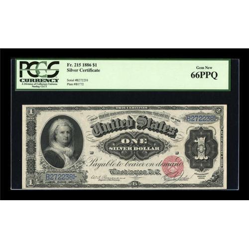 <B>Fr. 215 $1 1886 Silver Certificate PCGS Gem New 66PPQ.</B></I> A lovely example of the earliest Martha number. The colors are wonderful, and the note has been given the all-important PPQ designation. This is the most available of the 1886 Marthas, which makes it an ideal example to represent the type.<BR><BR><b>Shipping:</b> Coins & Currency (<a target="_blank" href="http://www.heritageauctions.com/common/shipping.php">view shipping information</a>)