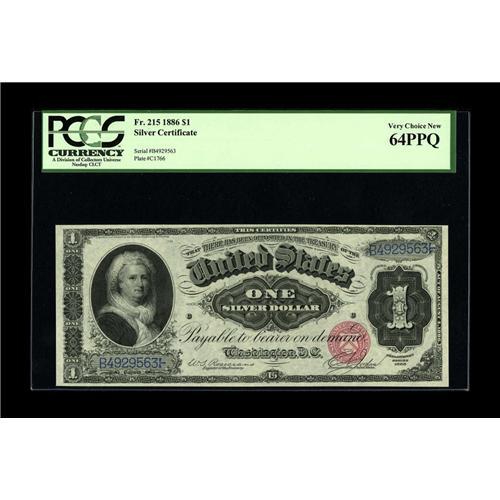 <B>Fr. 215 $1 1886 Silver Certificate PCGS Very Choice New 64PPQ.</B></I> But for being a touch tight at the right end at the top, this earliest note of the Martha Aces is superb. The colors, embossing, and print quality are as good as it gets.<BR><I>From The Bill and Kathy Stella Currency Collection</B></I><BR><BR><b>Shipping:</b> Coin/Currency (<a target="_blank" href="http://www.heritageauctions.com/common/shipping.php">view shipping information</a>)