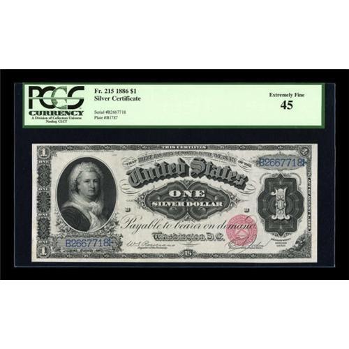 <B>Fr. 215 $1 1886 Silver Certificate PCGS Extremely Fine 45.</B></I> This Martha is very pleasing and quite bright. <BR><BR><b>Shipping:</b> Coins & Currency (<a target="_blank" href="http://www.heritageauctions.com/common/shipping.php">view shipping information</a>)
