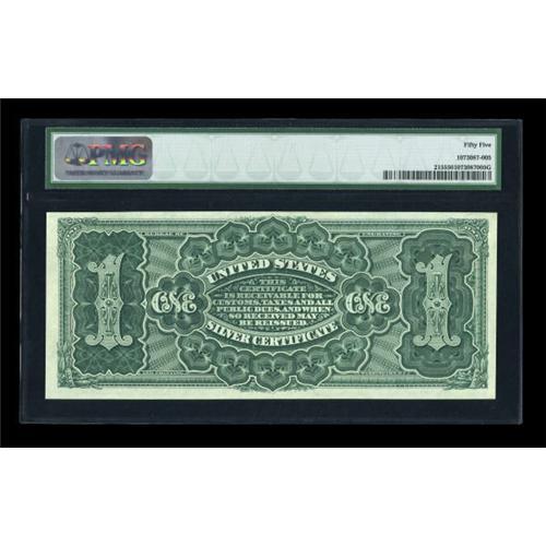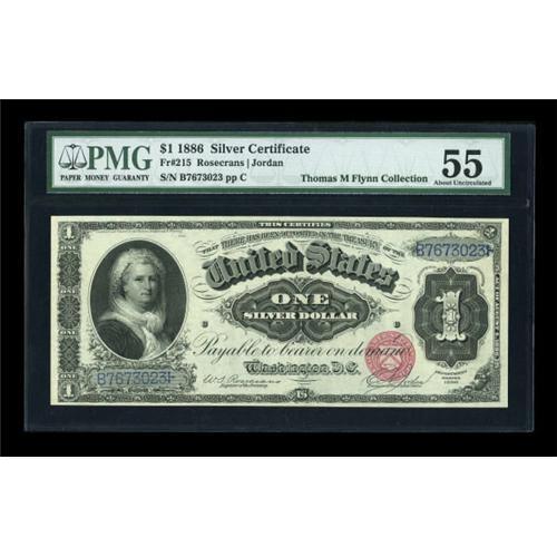 <B>Fr. 215 $1 1886 Silver Certificate PMG About Uncirculated 55.</B></I> A beautifully margined example of the earliest of the Martha Silver Certificates. Through the third-party holder, this piece has the eye appeal of a Choice New example.<BR><I>From The Thomas M. Flynn Collection</B></I><BR><BR><b>Shipping:</b> Coins & Currency (<a target="_blank" href="http://www.heritageauctions.com/common/shipping.php">view shipping information</a>)