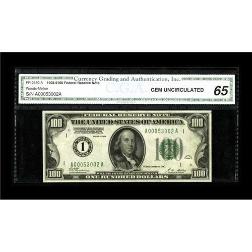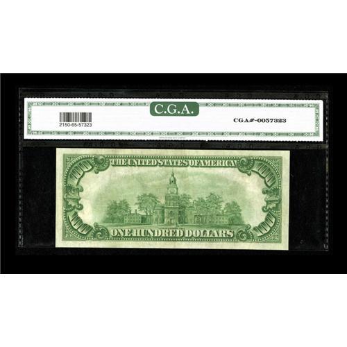 <B>Fr. 2150-A $100 1928 Federal Reserve Note. CGA Gem Uncirculated 65.</B></I><BR>This example is from the very tough Boston district, and has been encapsulated and graded Gem Uncirculated 65 by CGA.<BR><BR><b>Shipping:</b> Coins & Currency (<a target="_blank" href="http://www.heritageauctions.com/common/shipping.php">view shipping information</a>)