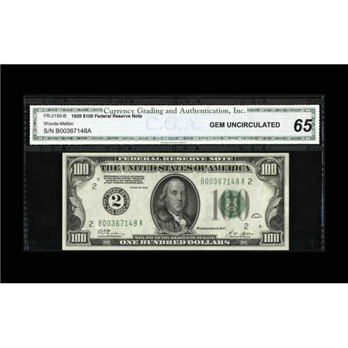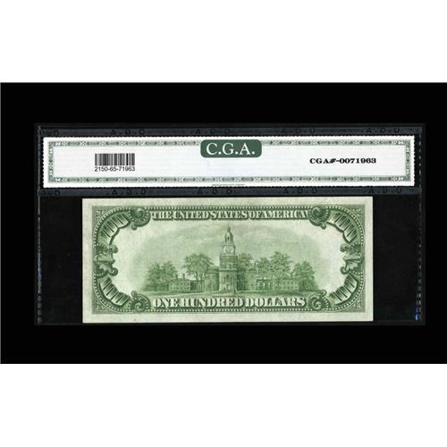 <B>Fr. 2150-B $100 1928 Federal Reserve Note. CGA Gem Uncirculated 65.</B></I><BR>A well centered New York $100 that resides in a CGA Gem Uncirculated 65 holder.