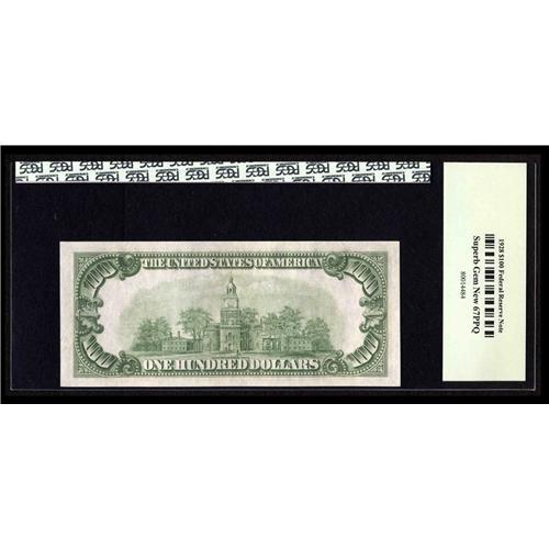 <B>Fr. 2150-D $100 1928 Federal Reserve Note. PCGS Superb Gem New 67PPQ.</B></I><BR>A beautifully centered pack fresh example displaying jumbo margins. Experienced collectors realize just how difficult it can be to locate a $100 1934 FRN with this degree of perfection.