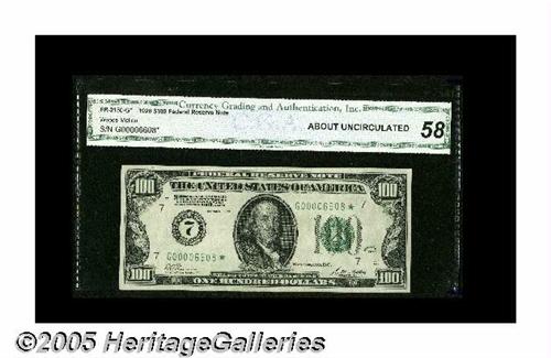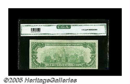 <B>Fr. 2150-G* $100 1928 Federal Reserve Note. CGA About Uncirculated 58.</B></I><BR>A high-end example of this scarce star which has been graded and encapsulated by CGA.