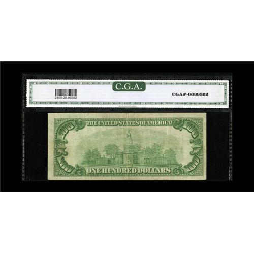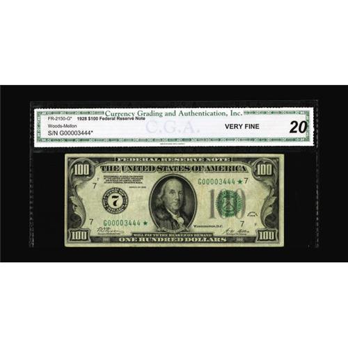 <B>Fr. 2150-G* $100 1928 Federal Reserve Note. CGA Very Fine 20.</B></I><BR>Only 72,000 replacement notes were printed. This mid grade example carries a neat serial number.