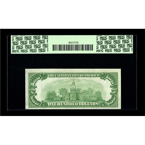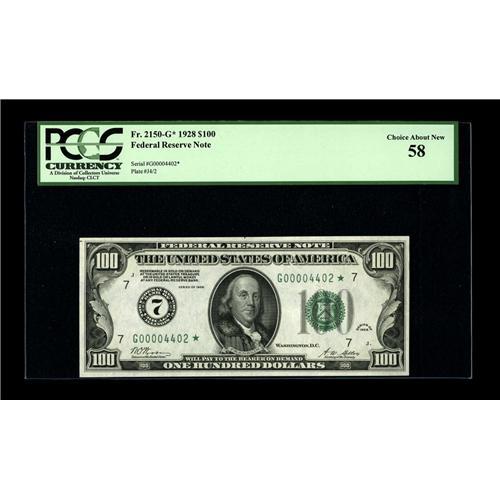 <B>Fr. 2150-G* $100 1928 Federal Reserve Note. PCGS Choice About New 58.</B></I><BR>A high-end example of this scarce star which has been graded and encapsulated by PCGS.<BR><I>From The Bill and Kathy Stella Currency Collection</B></I><BR><BR><b>Shipping:</b> Coin/Currency (<a target="_blank" href="http://www.heritageauctions.com/common/shipping.php">view shipping information</a>)