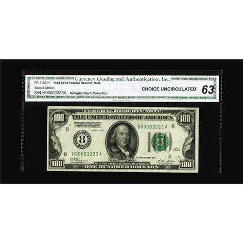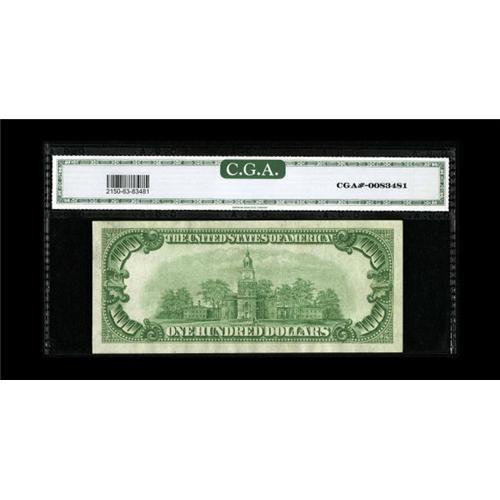 <B>Fr. 2150-H $100 1928 Federal Reserve Note. CGA Choice Uncirculated 63.</B></I><BR>Crisp and bright this green seal with number district designation has a neat four digit serial number.
