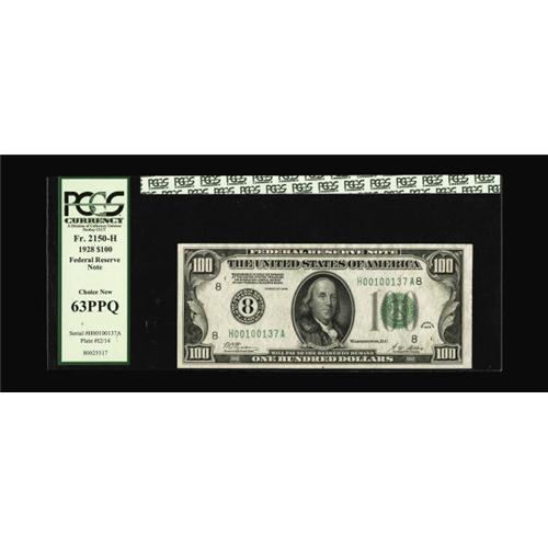 <B>Fr. 2150-H $100 1928 Federal Reserve Note. PCGS Choice New 63PPQ.</B></I><BR>Well centered and bright, a nice C-note with a numbered seal.