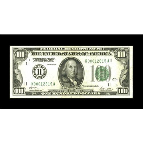 <B>Fr. 2150-K $100 1928 Federal Reserve Note. Choice About Uncirculated.</B></I><BR>This example becomes the lowest serial number known off the Dallas district which also had the lowest printing with only 80,140 notes printed. Well margined and bright it should prove to see a flourish of activity.<BR><BR><b>Shipping:</b> Coin/Currency (<a target="_blank" href="http://www.heritageauctions.com/common/shipping.php">view shipping information</a>)