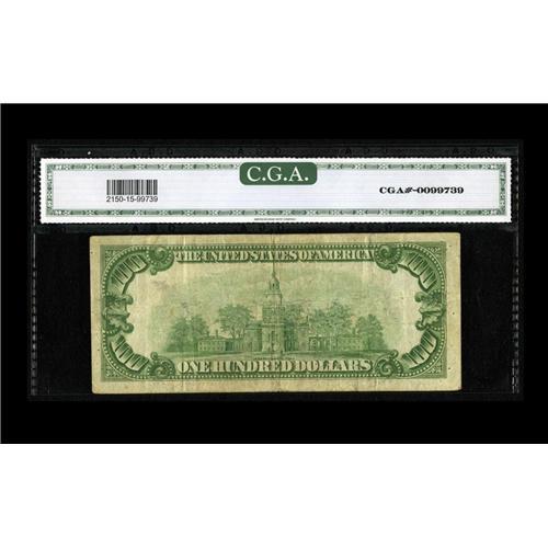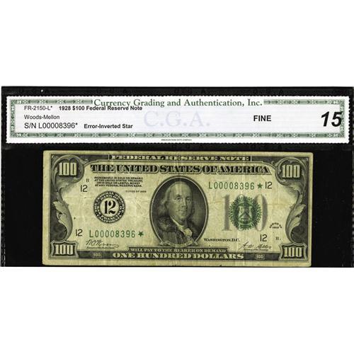 <B>Fr. 2150-L* $100 1928 Federal Reserve Note. CGA Fine 15.</B></I><BR>This average circulated specimen proudly displays the famous error well. This occurred on very few of the lowest number sheets printed.