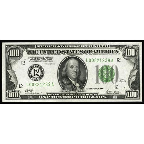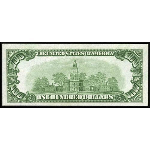 <B>Fr. 2150-L $100 1928 Federal Reserve Note. Choice About Uncirculated.</B></I><BR>Few 1928 FRN's show the depth of embossing that this note features. Combine solid margins and bright white paper, one wants to completely ignore the light bend that keeps this note from receiving a Gem grade.