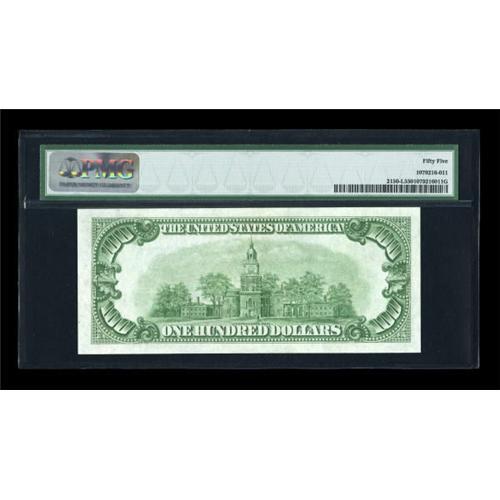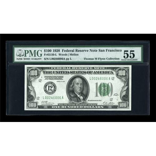 <B>Fr. 2150-L $100 1928 Federal Reserve Note. PMG About Uncirculated 55.</B></I><BR> A well centered piece with loads of eye appeal for the grade. <BR><I>From The Thomas M. Flynn Collection</B></I><BR><BR><b>Shipping:</b> Coins & Currency (<a target="_blank" href="http://www.heritageauctions.com/common/shipping.php">view shipping information</a>)