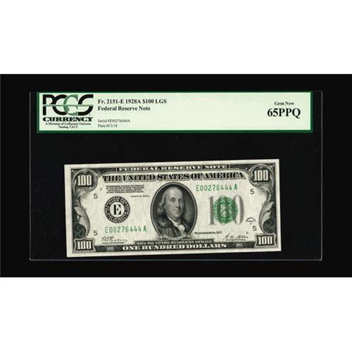 <B>Fr. 2151-E $100 1928A Federal Reserve Note. PCGS Gem New 65PPQ.</B></I><BR>This series is rather scarce in high grade and we have only auctioned a few new examples from Richmond.